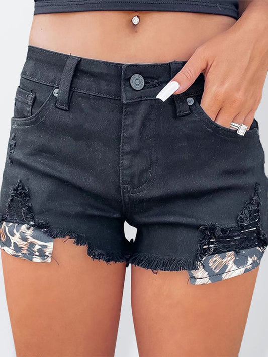 Women's High Waist Leopard Pocket Ripped Denim Shorts