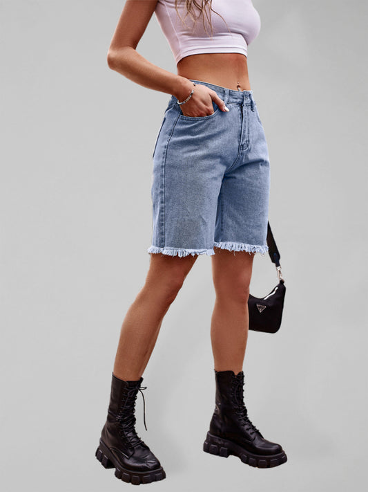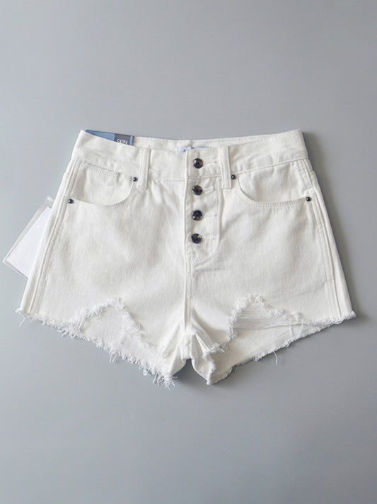 Women's high-waisted buttoned-up washed ripped raw edge denim shorts hot pants