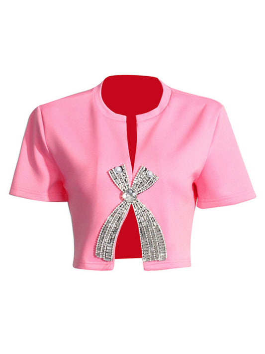 New short-sleeved street solid color bow print round neck casual T-shirt