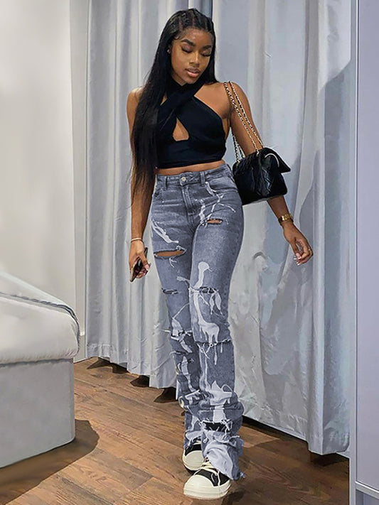 Ladies Ripped High-Rise Wide-Leg Jeans