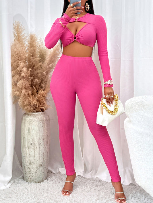 New spring and summer solid color slim long-sleeved tops and trousers two-piece set