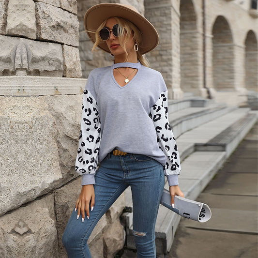 European and American Contrast Knit Sweater Grey Long Sleeve Hollow Sweater