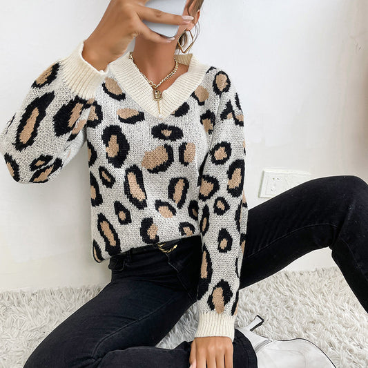 Turtleneck Jacquard Black Leopard Print European and American Sweater