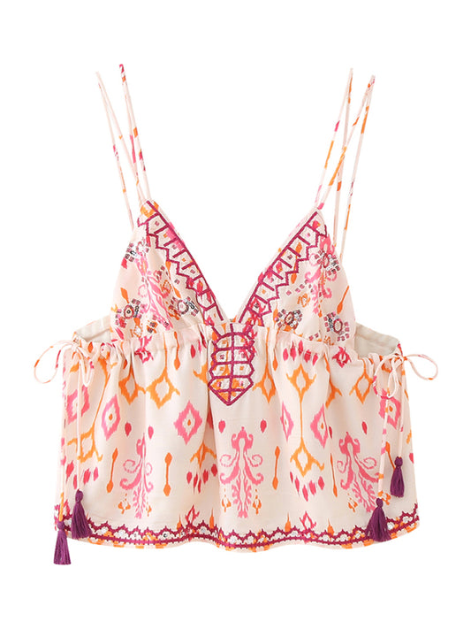 Simple V-neck Metal Buckle Printed Vest Top Women