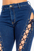 The high-rise lace-up jeans are a trendy and stylish choice for a fashion-forward look. With their high-rise design, these jeans offer a flattering fit that accentuates the waist. The lace-up detail adds a unique and edgy touch to the classic denim style. Perfect for dressing up or down, these jeans can be paired with a variety of tops for different occasions. Stay on-trend and make a fashion statement with the high-rise lace-up jeans that will elevate your outfit. Add a touch of attitude to your wardrobe with these stylish and versatile jeans.