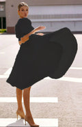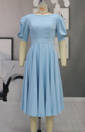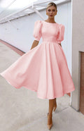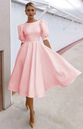 Elegant big swing dress in soft, solid color pink. Round neckline enhances graceful and poised look. Slim fit design flatters the feminine silhouette. Crafted for spring-summer comfort and style. Pair with nude heels for a sophisticated ensemble. Perfect for weddings, parties, or formal events. Available for Wholesale and Dropshipping.