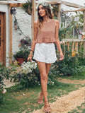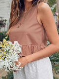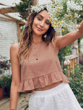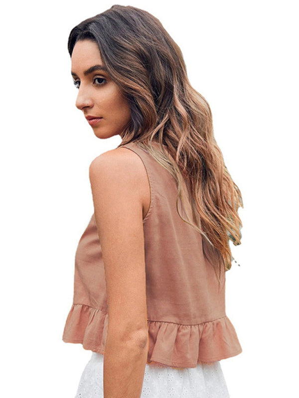 Women's sleeveless lotus leaf edge hem pure color round neck top